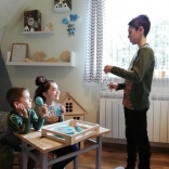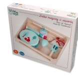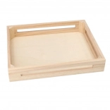 Alle Teile des Sets sind ordentlich in einem Holztablett mit Griffen verstaut – einfacher Transport, Ordnung und sichere Aufbewahrung zu Hause und im Kindergarten.
