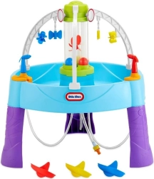 Der Tisch ist mit verschiedenen Elementen ausgestattet, wie drehbaren Zielen und einer Wasserwalze, die die Kinder zur dynamischen Spielweise und zur Entwicklung ihrer Fähigkeiten anregen.