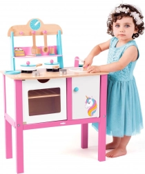 Entdecken Sie die zauberhafte WOODY-Küche mit Einhorn-Motiv, die das Kinderzimmer in ein kreatives Küchenstudio verwandelt. Dank sorgfältiger Verarbeitung aus hochwertigem Sperrholz und Holz ist sie stabil, langlebig und optisch ansprechend – eine hervorragende Wahl für das tägliche Kochspiel.