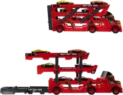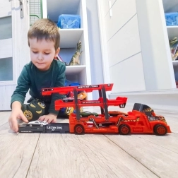 Dieser robuste Autotransporter kombiniert ein attraktives Design mit cleveren Funktionen für stundenlangen kreativen Spielspaß. Die dreistöckige Plattform bietet Platz für alle sechs Autos, die klappbare Heckrampe erleichtert das Auffahren und die vordere Ausfahrt erweitert die Spielmöglichkeiten. Mit Metall-Die-Cast-Autos und der detailreichen Verarbeitung wirkt das Spiel realistisch und fördert Fantasie und Feinmotorik.