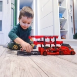 Die durchdachte Konstruktion mit drei Ebenen fasst alle sechs Fahrzeuge. Die klappbare Heckrampe sorgt für einfaches Auffahren, die vordere Ausfahrt bringt Dynamik ins Spiel.