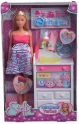 Schwangere Puppe Steffi mit Zwillingen Steffi erwartet zwei Neugeborene, inklusive Schrank mit Wickelkommode, mit Mobile, mit ausziehbarer Schublade, 29 cm.