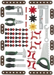 Im Set ist alles für die ersten Heimwerkerprojekte enthalten – von der Säge und dem Hammer über Feilen und Schlüssel bis zu Schrauben, Muttern und Verbindern. Das Spiel mit der Werkstatt fördert Auge-Hand-Koordination, logisches Denken und Geduld und sorgt zugleich für stundenlangen Spielspaß.