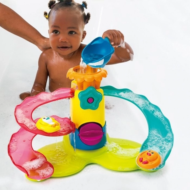 Verwandeln Sie ein gewöhnliches Bad in ein Abenteuer mit unserem bunten Kunststoff-Aquapark! Dieses Spielzeug bietet zwei spiralförmige Wasserrutschen, die mit einem zentralen Turm mit einer blauen Blumentaste und einer Krake oben verbunden sind, was zu sensorischem und imaginativem Spiel anregt. Kinder genießen stundenlangen Spaß im Badezimmer mit diesem Spielzeug, das Bewegung und farbliche Stimulation unterstützt. Inklusive zwei Tieren auf Pontons und einer Walschaufe für das Eingießen von Wasser.