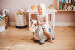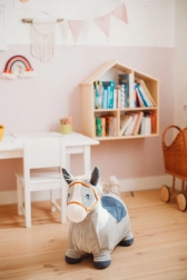 Die angenehm weiche Oberfläche und die stabile Form des Hüpf-Esels laden zum Spielen ein und helfen Kindern zugleich, das Gleichgewicht zu halten. Die bequeme Sitzhöhe von 28 cm erleichtert das Aufsitzen.