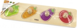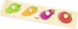 Kinder lernen auf natürliche Weise, die Farben und Formen von Gemüse – Paprika, Karotte, Aubergine und Tomate – zu erkennen und den passenden Aussparungen zuzuordnen.