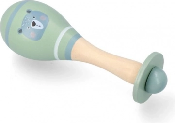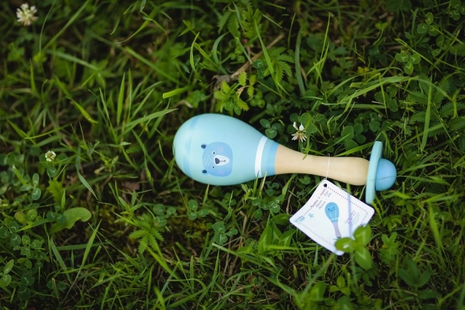 Der Holzgriff mit glatter Oberfläche und ausgewogener Form ermöglicht bequemes Halten und sicheres Schütteln bereits ab 5 Monaten.