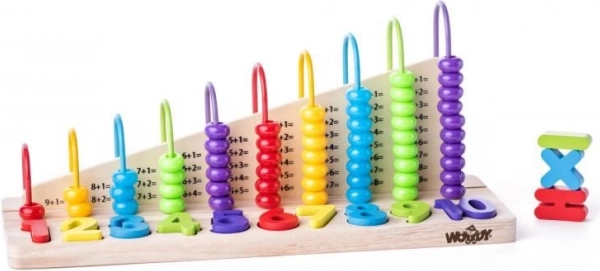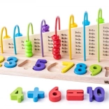 Das Set enthält einen Holzrechenrahmen und 13 herausnehmbare bunte Blöcke in Form von Zahlen und Symbolen +, - und =.