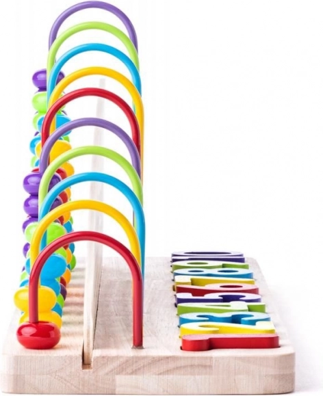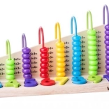 Der Rechenrahmen besteht aus einer Holzbasis mit Metallführungen, auf denen bunte Plastikkugeln sind. Die Tafel in der Mitte bietet auf einer Seite Aufgaben zur Addition und auf der anderen zur Subtraktion. Zum Set gehören auch bunte herausnehmbare Blöcke mit Zahlen und den Symbolen +, - und =.
