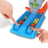 Der mechanische Zweikanal-Launcher schießt die Autos gleichzeitig ab – ideal für Head‑to‑Head‑Duelle und Reaktionsmessungen ganz ohne Batterien.