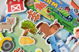Schenken Sie Kindern ein Bad voller Fantasie. Das Set aus Schaumstoff-Stickern mit Bauernhof-Motiv enthält 18 Teile – niedliche Tiere, einen Traktor, eine Scheune und weitere Elemente, die Kinder nach Belieben kombinieren und zu eigenen Geschichten arrangieren. Ein Tropfen Wasser genügt und die Sticker halten fest auf glatten Oberflächen, lassen sich aber ebenso leicht abnehmen und erneut verwenden.