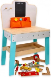 Holztisch mit bunten Plastikinstrumenten wie Hammer und Schrauben. Die Tafel 'JOB LIST' fördert Planung und Kreativität.