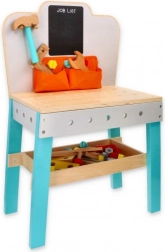 Der Kinder-Holzarbeitstisch mit Tafel ist ein ideales Geschenk für kleine Handwerker. Der Tisch enthält speziell angepasste Holzinstrumente wie Hammer, Säge und Schlüssel, die es Kindern ermöglichen, verschiedene Konstruktions- und Reparaturarbeiten zu simulieren. Mit der Tafel 'JOB LIST' können Kinder ihre Projekte planen und Organisationsfähigkeiten erlernen. Praktische Werkzeugtaschen und Regale bieten reichlich Stauraum.