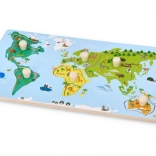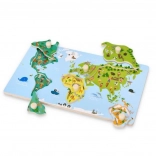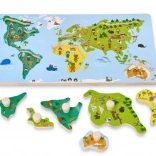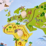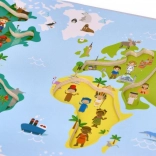 Das Puzzle zeigt Kontinente mit auffälligen Farben und gezeichneten Tieren und Sehenswürdigkeiten, was es Kindern erleichtert, Geographie zu lernen und Spaß zu haben.
