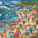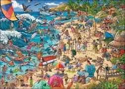 Das zusammengesetzte Puzzle hat die Maße von ca. 70 x 50 cm und ist ideal für gemeinsame Familienzeit oder entspannte Momente allein. Tauchen Sie ein in die lebendige Strandatmosphäre, wo Menschen Surfen, Schwimmen und Entspannen an einem sonnigen Tag genießen.