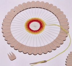 Runde Holzrahmen mit gezahntem Rand halten die Kettfäden stabil, sodass die Muster präzise werden und die Arbeit auch für Einsteiger angenehm ist.