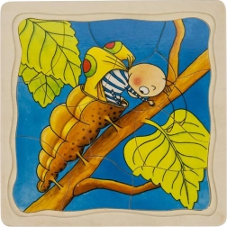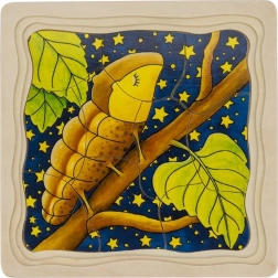 Das mehrschichtige Holzpuzzle Schmetterling von GOKI bietet Kindern eine fesselnde Form des Lernens. Jede Schicht stellt eine Entwicklungsphase des Schmetterlings dar und hat eine andere Anzahl an Teilen, was schrittweises Lernen und Konzentration unterstützt. Die robuste Holzplatte mit festem Rand dient als stabile Unterlage für bequemes Puzzeln.