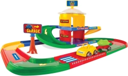 Die zweistöckige Kinder-Garage WADER PLAY TRACKS bringt eine variable Rennbahn mit 3,4 m Länge und umfangreichem Zubehör. Aus bunten Teilen lassen sich leicht verschiedene Strecken, Abfahrten und Parkplätze bauen, die zu fantasievollem Spiel und zur Simulation von Verkehrssituationen anregen. Das Set enthält ein Kid Cars Sport Auto mit Anhänger und ein weiteres Fahrzeug, Dekorationen sowie 96 Aufkleber zum einfachen Verzieren der Strecke und der Garage.
