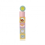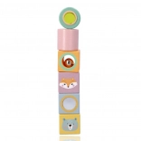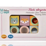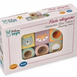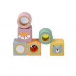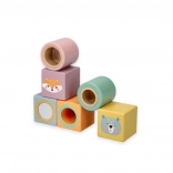 Die Bausteine sind mit fröhlichen Illustrationen von Tieren wie Fuchs und Bär verziert, was dem Spiel eine neue Dimension der Unterhaltung und Kreativität verleiht.