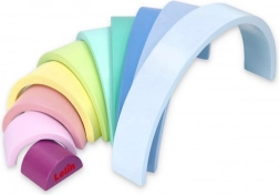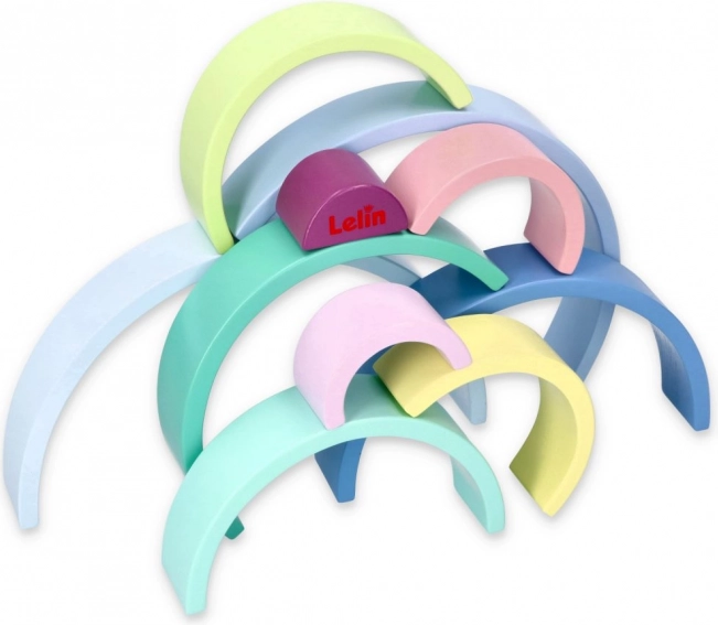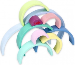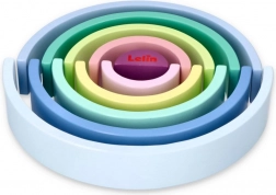 Die Holzscheiben in Pastellfarben wie Blau, Grün und Rosa fördern das Farbverständnis und kreatives Spielen.