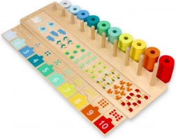 hölzerne Grundplatte mit Stiften, bunte Ringe, Zahlenteile 1–10