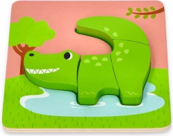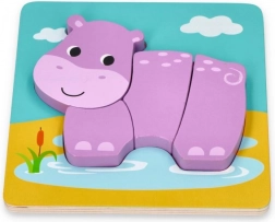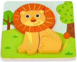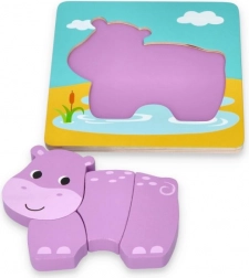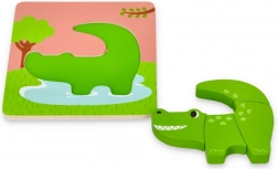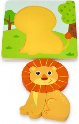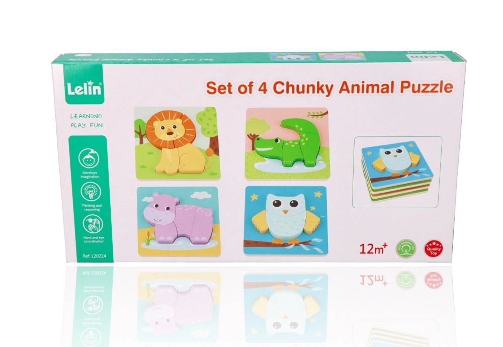 Kinder setzen nach und nach Krokodil, Nilpferd, Eule und Löwe zusammen – jedes Motiv auf einer separaten Holztafel fördert Konzentration und die Freude am Erfolg.