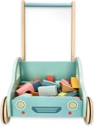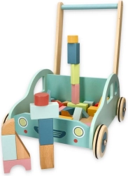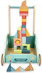 Bunte Holzbausteine fördern die Feinmotorik, die Vorstellungskraft und das logische Denken. Der Wagen dient als praktischer Stauraum für Bausteine und fertige Bauwerke.