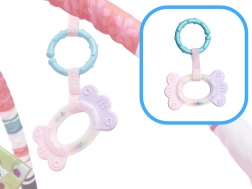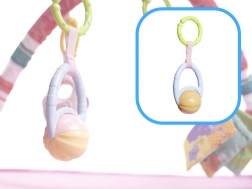 Diese farbenfrohe Spielmatte bietet eine abwechslungsreiche Spielfläche mit Bögen voller hängender Spielzeuge.