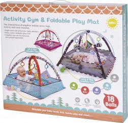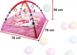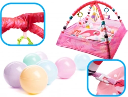 Die Matte ist stabil und widerstandsfähig, entwickelt für eine langfristige Nutzung. Die aufgehängten Spielzeuge und pastellfarbenen Bälle fördern die Sinnesentwicklung.