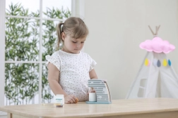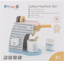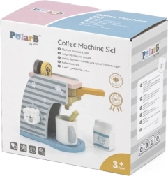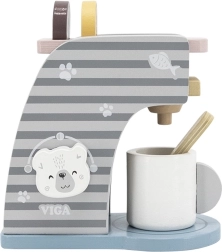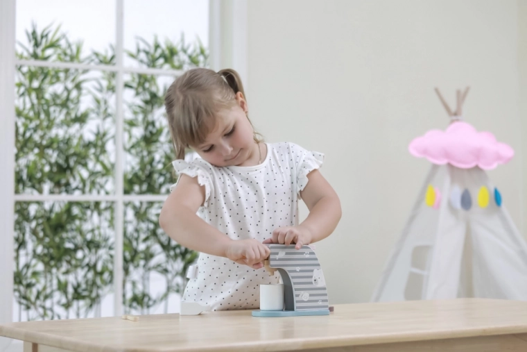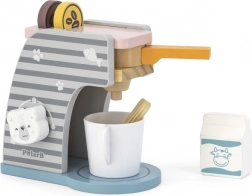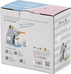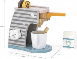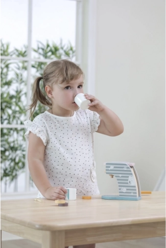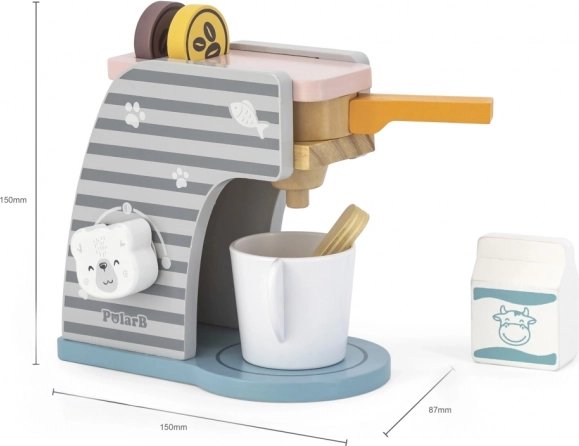 Diese Holz-Kaffeemaschine für Kinder in zarten Farben mit niedlichen Motiven ist für kleine Baristas entworfen. Drehbare Elemente und ein Hebelsystem imitieren eine echte Kaffeemaschine, sodass Kinder „Espresso“ machen, „Milch“ hinzufügen und mit dem Löffel in der weißen Tasse umrühren können.
