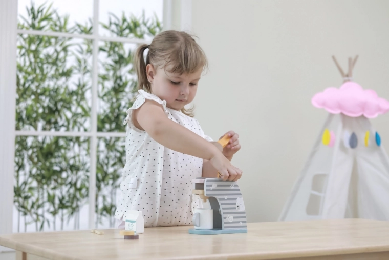 Die stilvolle Holz-Kaffeemaschine für Kinder ab 3 Jahren bringt die realistische Kaffeezubereitung in jede Kinderküche. Dank Drehregler, Siebträger und beiliegendem Zubehör (Tasse, Löffel, Kapseln und „Milch“) fördert sie Feinmotorik, Vorstellungskraft und Rollenspiel. Kompakte Maße und hochwertig lackiertes Holz sorgen für sicheres und langlebiges Spiel jeden Tag.