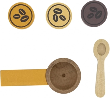 - Komplettset: Tasse, Löffel, Siebträger, Holzkapseln/„Bohnen“, „Milch“-Kartönchen.