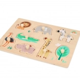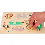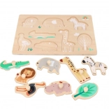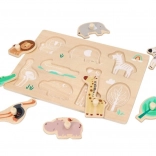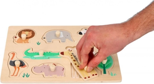 Dieses Holz-Puzzle mit Safari-Motiven ist ideal für Kinder ab 12 Monaten. Jedes Puzzleteil stellt ein anderes Tier dar, wie Löwe, Elefant oder Giraffe, was die Erkennung von Tieren fördert. Das Puzzle ist mit Griffen für einfachen Halt und Handhabung gestaltet, was für die Entwicklung der Feinmotorik bei Kleinkindern großartig ist.