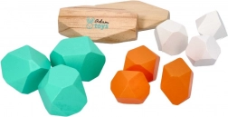 Bunte geometrische Formen, einschließlich türkisfarbener, oranger und weißer polyedrischer Formen, zusammen mit einer Basis aus Naturholz, bieten eine stilvolle Optik.