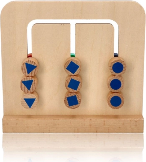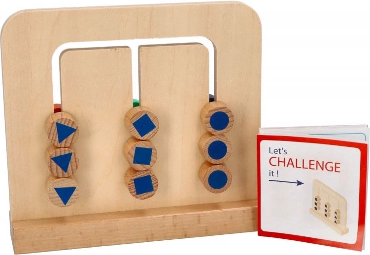 Das Set enthält ein Holzpuzzle mit 9 Blöcken in 3 Farben oder 3 Mustern auf der Rückseite sowie eine zweiseitige Broschüre mit Karten. Der Spaß besteht darin, die Blöcke so anzuordnen, dass sie das von Ihnen gewählte Muster bilden.