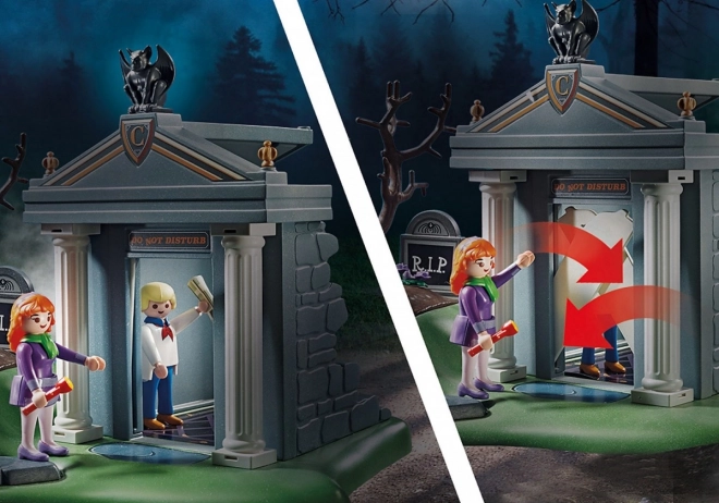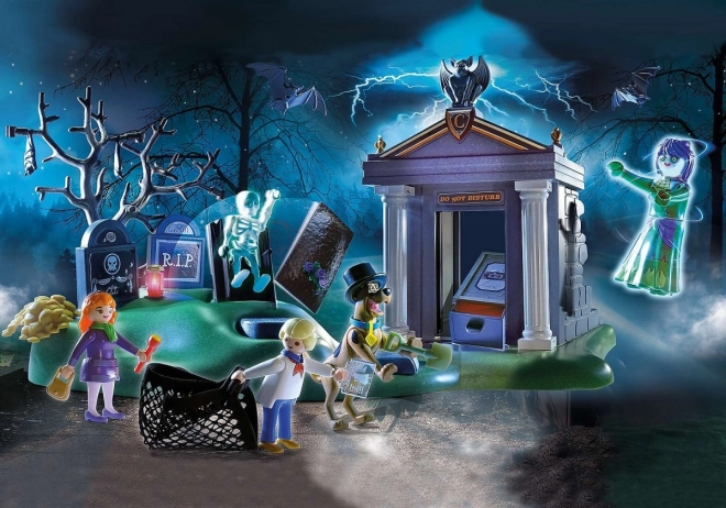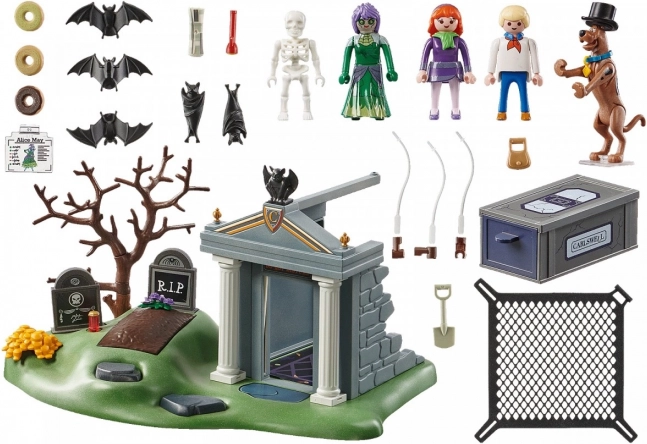 - Das Set beinhaltet Scooby-Doo im Totengräberkostüm, Fred, Daphne, den Geist Alice May, ein leuchtendes Skelett und viele gruselige Friedhofszubehörteile.
