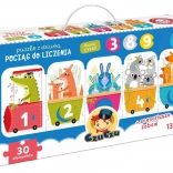 Das panoramische Puzzle mit Loch verwandelt Lernen in ein freudiges Spiel. Das Kind setzt den Zug aus 20 klassischen Puzzleteilen zusammen und ordnet anschließend 10 herausnehmbare Zahlenscheiben den entsprechenden Öffnungen zu. So trainiert es ganz natürlich das Zählen von 1–10, das Erkennen von Farben und Formen sowie den Wortschatz.