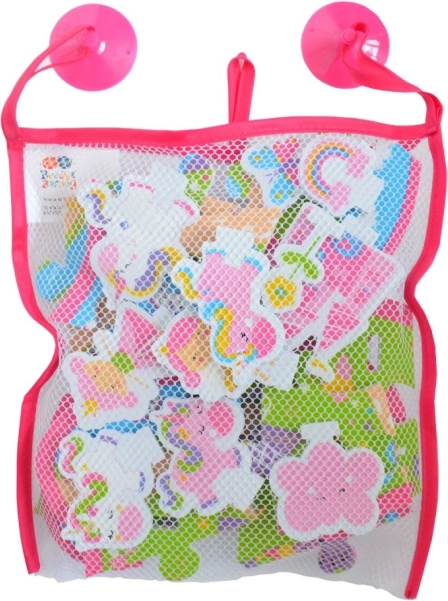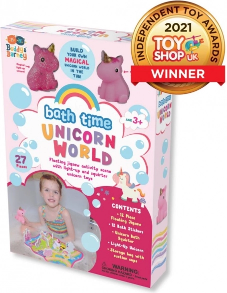 Bunte Schaumstoffteile schwimmen auf dem Wasser und haften nach dem Anfeuchten an den Wänden der Badewanne. Kinder können ihre eigene Einhornwelt zusammensetzen und Formen sowie Farben lernen.