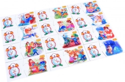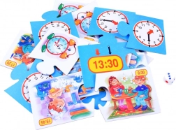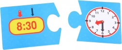 Das Set umfasst 24 Teile, die 12 Paare bilden. Jedes Paar besteht aus zwei Puzzleteilen - eines mit analoger Uhr und eines mit digitaler Uhr, die die gleiche Zeit anzeigen.
