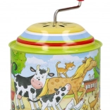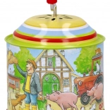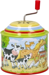 Die Spieluhr ist mit einer bunten Illustration eines Bauernhofs mit Figuren wie Kühen, Pferden, Katzen und Hühnern verziert.