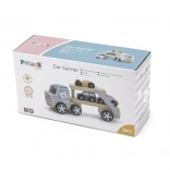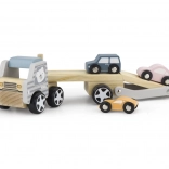 Der zweistufige Anhänger mit kippbarer Rampe unterstützt realitätsnahes Spiel und das Erlernen von Abfolgen – Kinder laden die Autos selbst auf und ab.