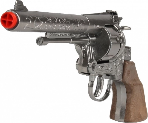 Metallischer Cowboy-Revolver mit Trommel für 12 Schuss.
