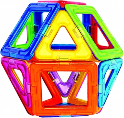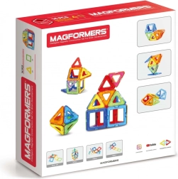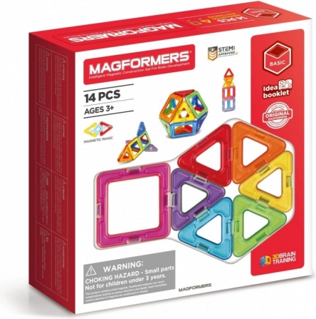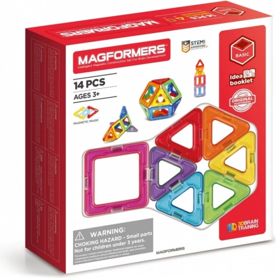 MAGFORMERS BASIC 14 sind Bausteine mit eingebauten starken Neodym-Magneten, die sich stets gegenseitig anziehen. Es genügt, die Seiten zweier Blöcke einander zu nähern, und sie verbinden sich sofort. Aus nach geometrischen Formen modellierten Bausteinen können Sie wunderschöne dreidimensionale Konstruktionen bauen. Beim Spielen können Sie die beiliegende Anleitung verwenden, weitere Beispiele auf den Seiten von magformersworld.com ansehen oder Ihrer eigenen Fantasie folgen. Das Set enthält: 8 Dreiecke; 6 Quadrate.