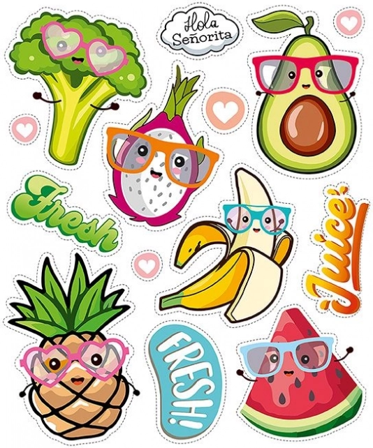 Der große Bogen mit Bügelstickern mit dem Motiv „Fröhliches Obst“ verwandelt einfache Kleidungsstücke im Handumdrehen in originelle, verspielte Unikate. Motiv ausschneiden, auf den Stoff legen und aufbügeln. Bei richtiger Anwendung sind die Drucke haltbar und pflegeleicht.
