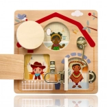 Diese sinnliche Aktivitätstafel verbindet Spiel und Lernen. Öffnende Türen, Haken, Riegel und weitere funktionale Elemente motivieren Kinder zum Entdecken, zum Üben der Finger und zur Geduld. Jedes Öffnen enthüllt farbige Illustrationen von Figuren aus verschiedenen Teilen der Welt, die das Bewusstsein für Vielfalt und das Erzählen von Geschichten fördern.