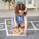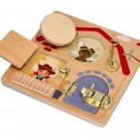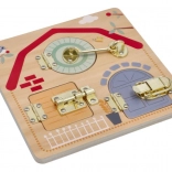 Die Tafel bietet mehrere Verschlussarten, die Kinder nach und nach meistern. Jeder Mechanismus bringt neue Herausforderungen und trainiert Fingerfertigkeit sowie Geduld.