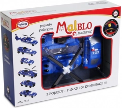 Entdecke die Welt der Action mit der Polizeiserie MalBlo MAGNETIC. Dank der cleveren magnetischen Schnappverbindungen verbinden Kinder die Module im Handumdrehen und bauen einen Hubschrauber, ein Auto oder ein spezielles Einsatzfahrzeug – und das in wenigen Augenblicken. Das Set enthält 9 Teile (3 fertige Fahrzeuge), die sich beliebig zu Dutzenden origineller Varianten kombinieren lassen.