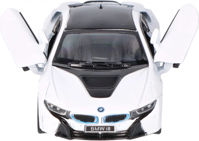 Die detailreiche Ausführung des Metallmodells BMW i8 umfasst präzise Designelemente wie den charakteristischen BMW-Kühlergrill und die Form der Scheinwerfer.