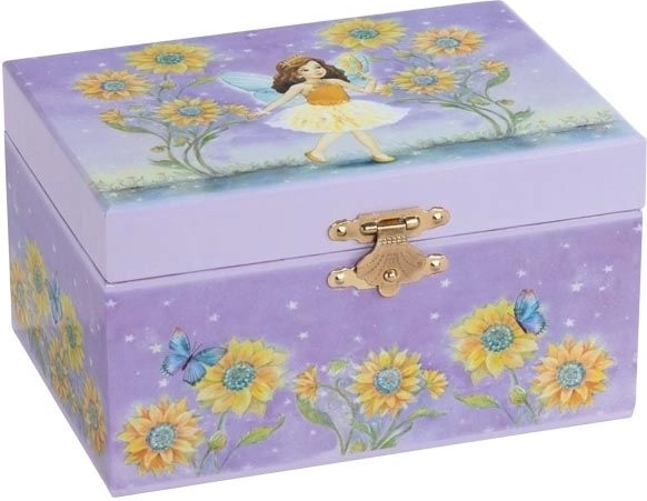 Diese Schatulle im Stil einer klassischen Spieluhr erfreut jedes Kind, das seine Schätze elegant aufbewahren möchte. Beim Öffnen des Deckels ertönt die zarte Melodie aus der Oper Schwanensee und eine kleine rotierende Ballerina beginnt vor dem eingebauten Spiegel zu tanzen. Das Sonnenblumenmotiv verleiht der Schatulle einen verspielten und zugleich zarten Look.