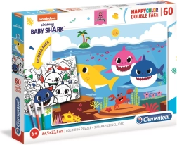 Entdecken Sie ein kreatives Spiel, das Kinder stundenlang beschäftigt. Das beidseitige BABY SHARK Puzzle zeigt auf der einen Seite ein buntes Motiv beliebter Meeresfiguren und auf der anderen ein schwarz-weißes Ausmalbild. So trainieren Kinder nicht nur das Puzzeln, sondern können das Bild auch nach eigener Fantasie gestalten.